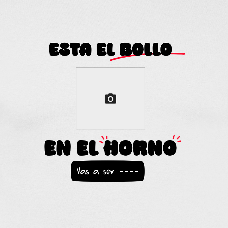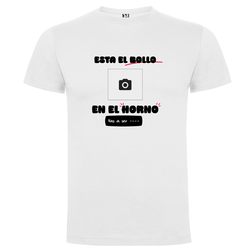 Diseñada especialmente para futuras mamás, esta camiseta presenta la divertida frase «Está el bollo en el horno», un espacio central para tu fotografía favorita y un texto editable que puedes personalizar para el destinatario. Ideal para anunciar tu embarazo de una manera original y emotiva.