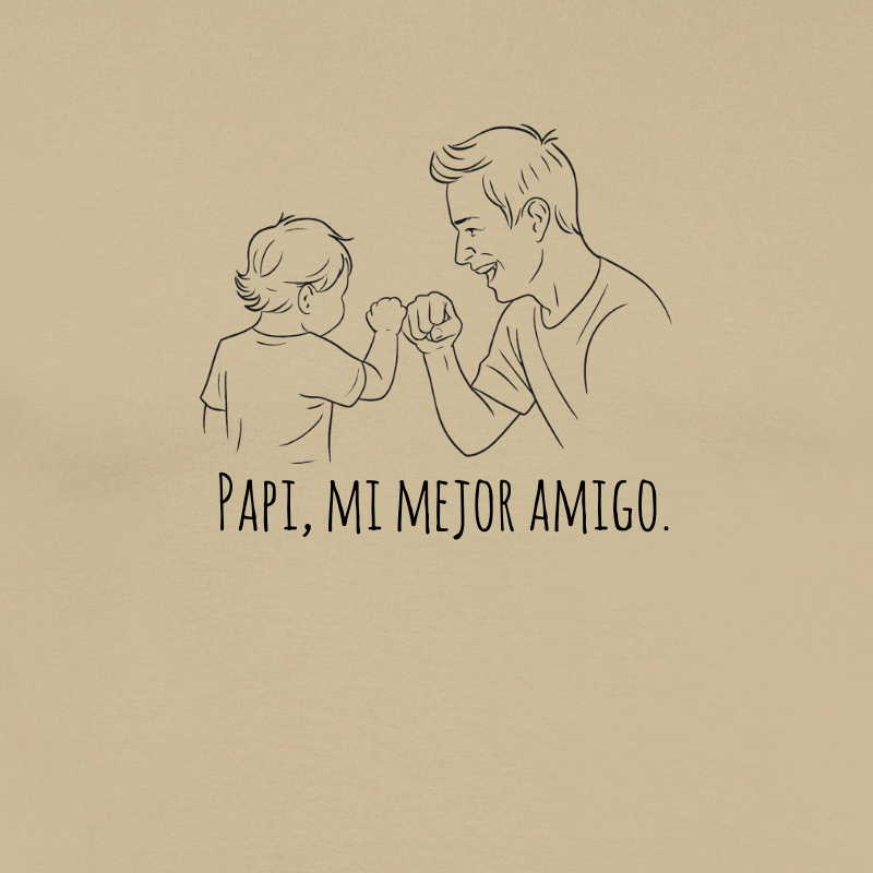 Esta exclusiva camiseta de algodón presenta una emotiva ilustración lineal de un padre e hijo haciendo un «fist bump» junto a la frase «Papi, mi mejor amigo». Ideal para padres primerizos, familias jóvenes o como un regalo significativo en el Día del Padre o en cumpleaños.
