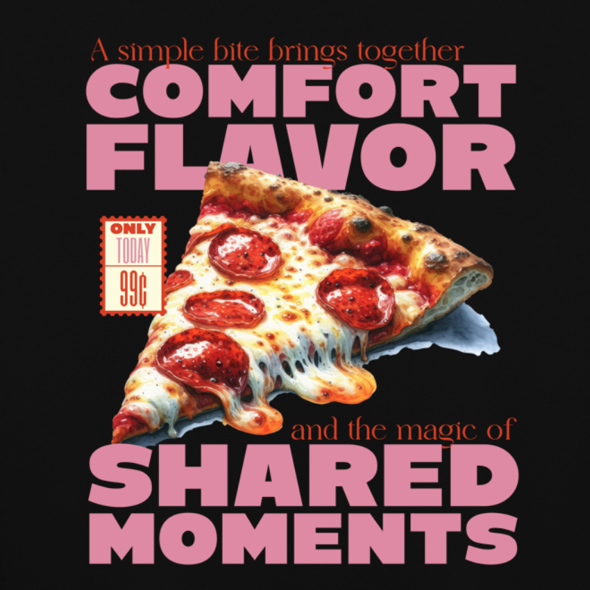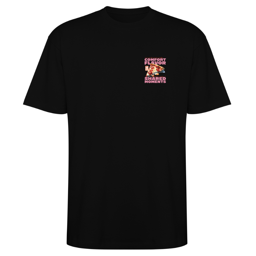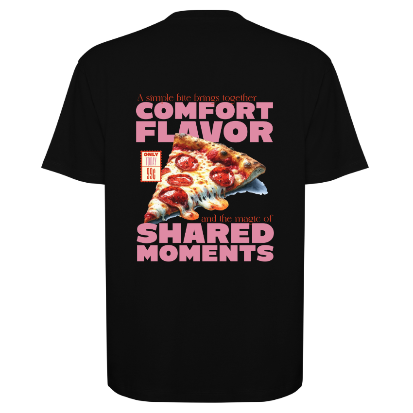 Esta camiseta presenta una ilustración hiperrealista de una porción de pizza de pepperoni con queso fundido, acompañada de las frases “COMFORT FLAVOR” y “SHARED MOMENTS” en tipografías de gran tamaño y color rosa pastel, complementadas por una elegante serif en naranja. Perfecta para foodies, jóvenes con estilo urbano y seguidores de la estética retro, es ideal para tus quedadas con amigos o eventos gastronómicos informales.