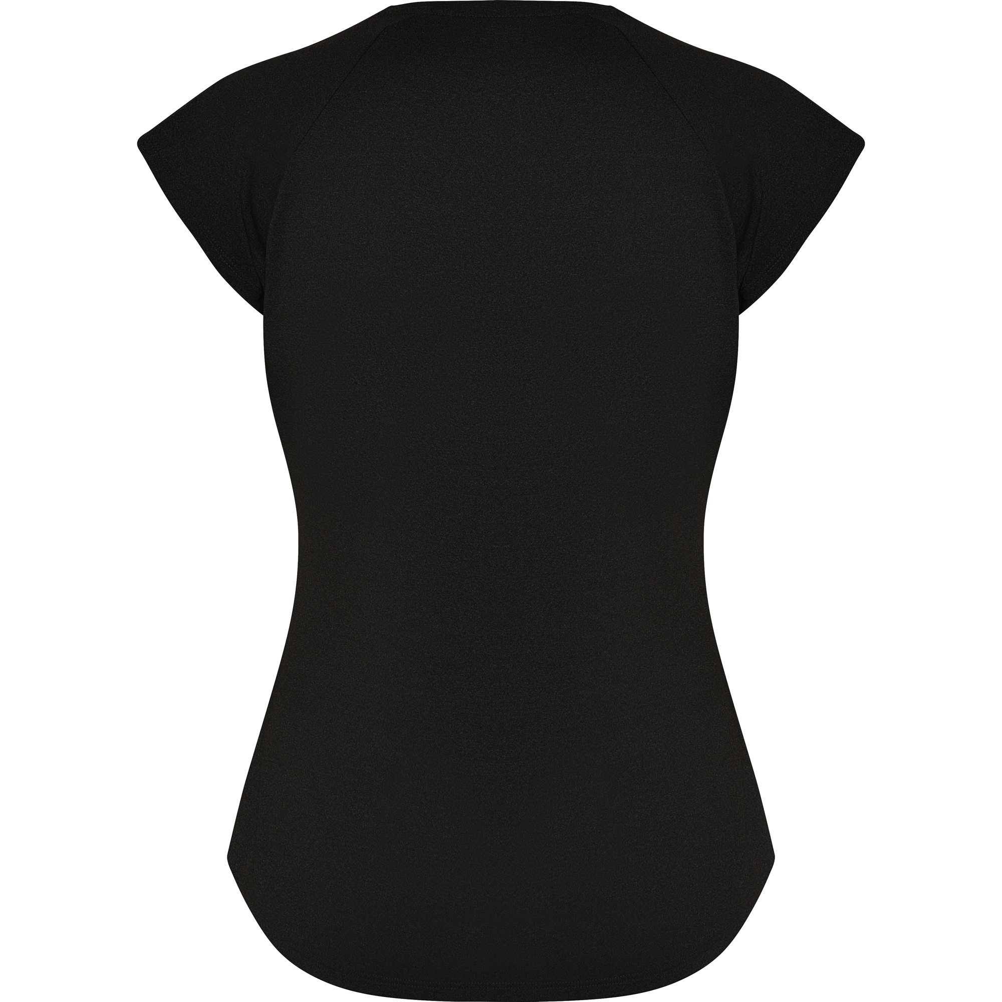Camiseta técnica multi-deporte de mujer manga corta estilo manga ranglan. Cuello pico. Tejido poliéster con tacto algodón. Corte entallado.